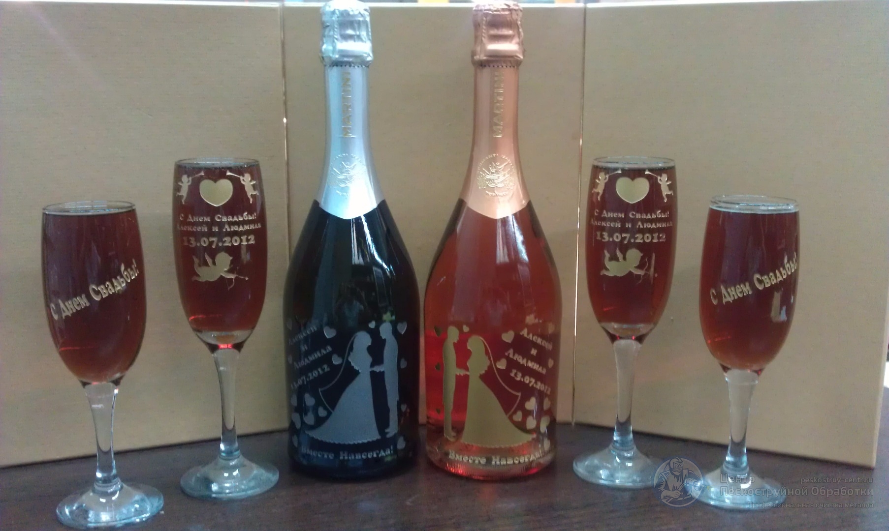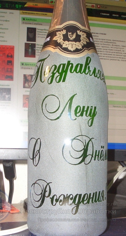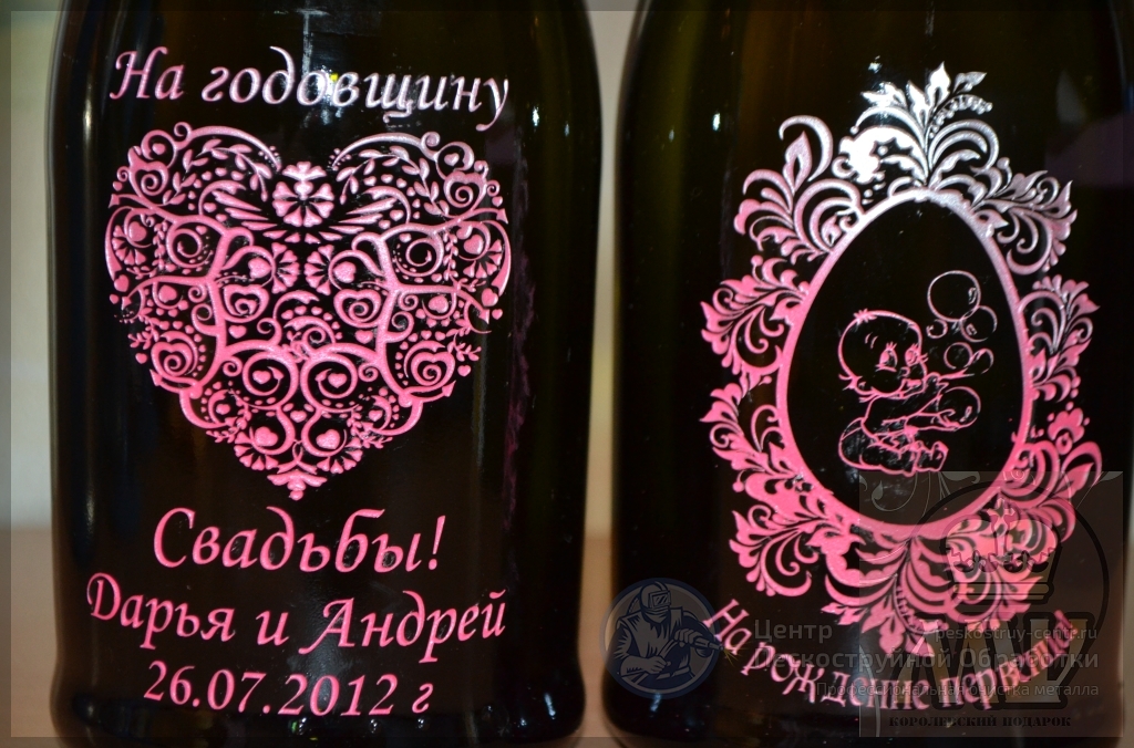 У Вас или Ваших знакомых намечается шикарный юбилей или знаменательный праздник, корпоратив? Хотите эксклюзивно удивить? Мы предлагаем Вам нанесение пескоструйного рисунка на бутылку шампанского, водки, коньяка, вина, с любой надписью и логотипом, символикой события. Для Вас, наши специалисты разработают индивидуальный дизайн бутылки.